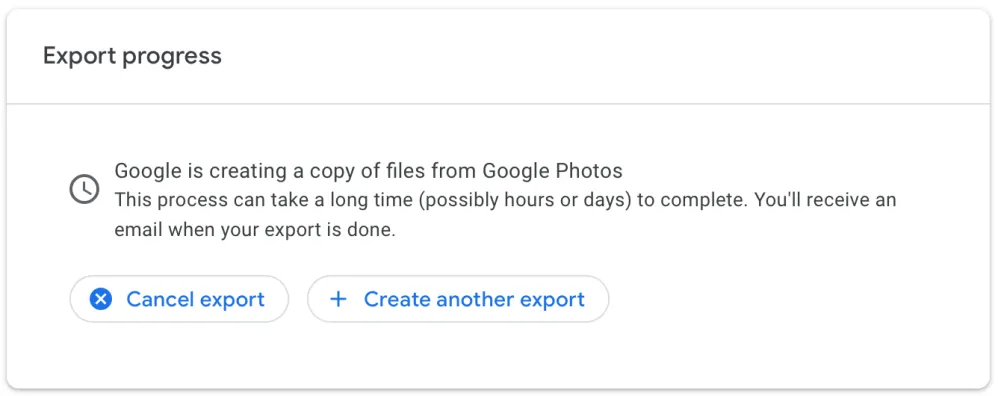 - リクエストが送信されると、「エクスポートの進行状況」メッセージが表示されます(ライブラリのサイズによっては、処理に「数時間または数日」かかる場合があります)。準備が完了したら、Google からのメールを確認してください。