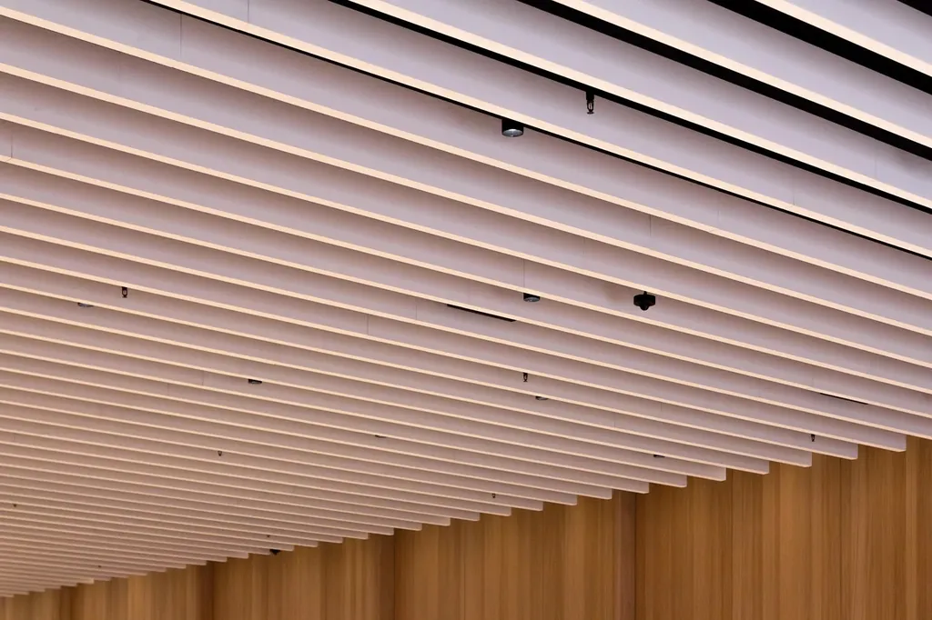 Appleは、ライトボックス天井の代わりに、音響を考慮して設計された新しい直線状のバッフル天井構造を採用しました。照明は個々の白いバッフルの間に配置されています。Appleによると、店舗のバイオジェニック素材と備品は環境的に持続可能なものを採用したとのことで、このプロジェクトに協力したベンダーのサンプルもその主張を裏付けています。